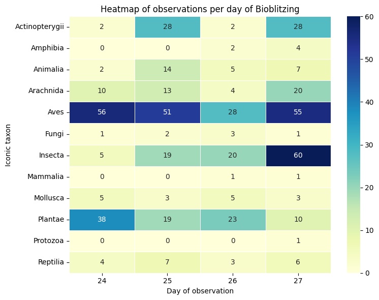 plt.title('Heatmap of observations per day of Bioblitzing')