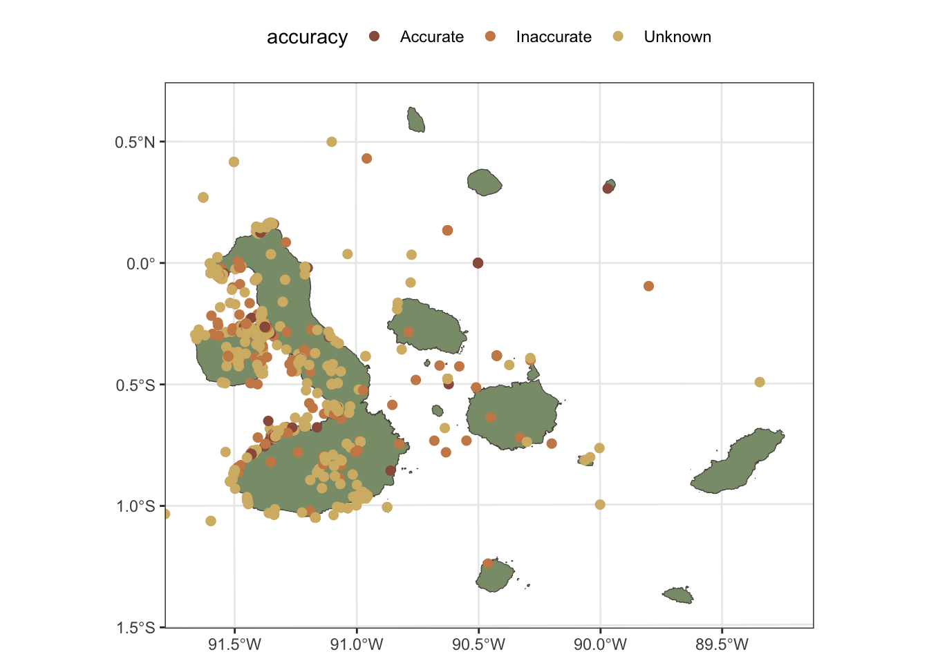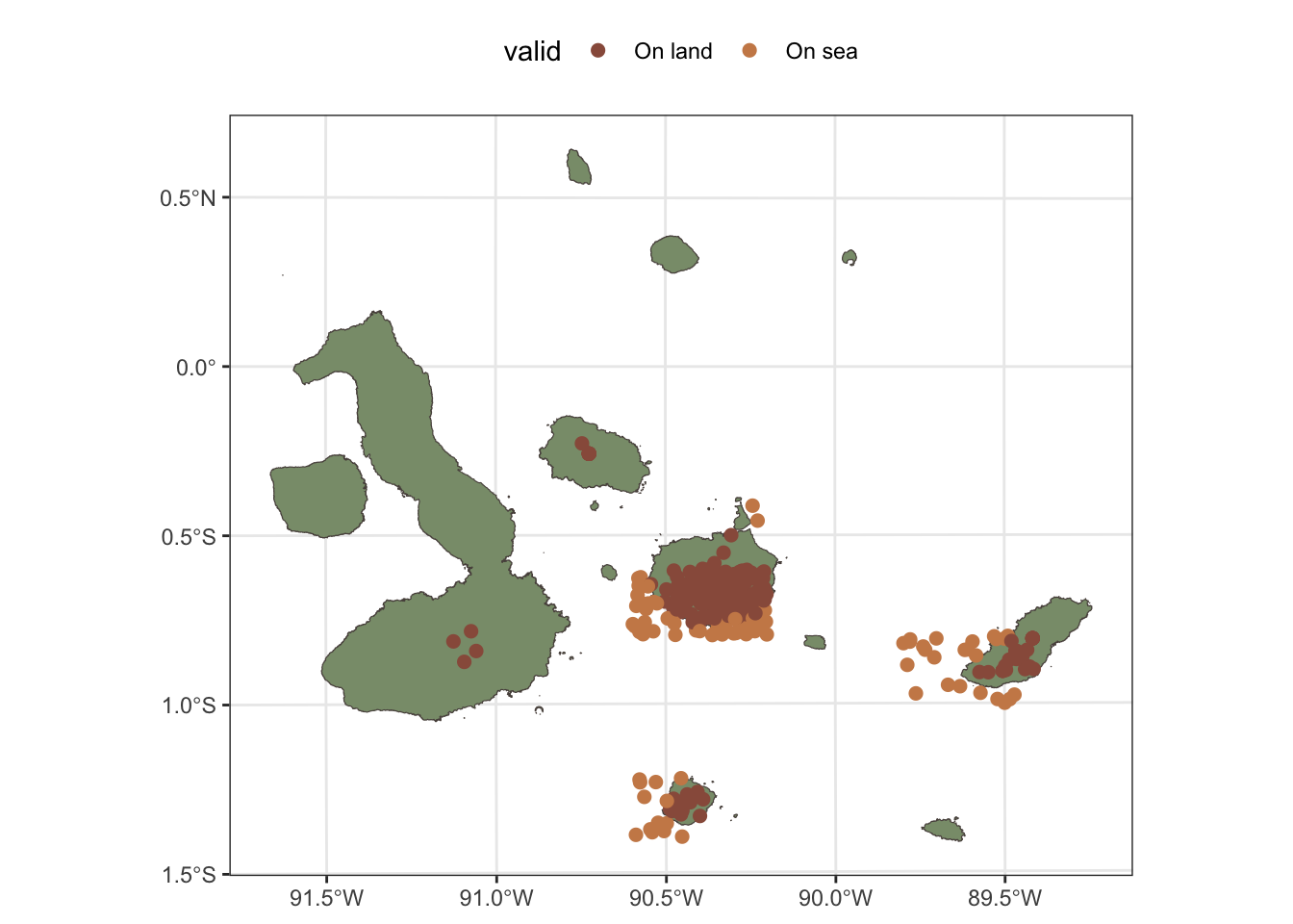 For Scalesia pedunculata, the situation is different, as the coordinates of the records have been obscured to protect the locations of this species, which is a common practice for sensitive species. In this case, we will not be able to filter the records based on positional accuracy, but we will filter these records to keep only those that are within the terrestrial parts of the Galápagos Islands. This allows us to still use the occurrence data to get an idea of the general distribution of the species and its associated ecosystem.
