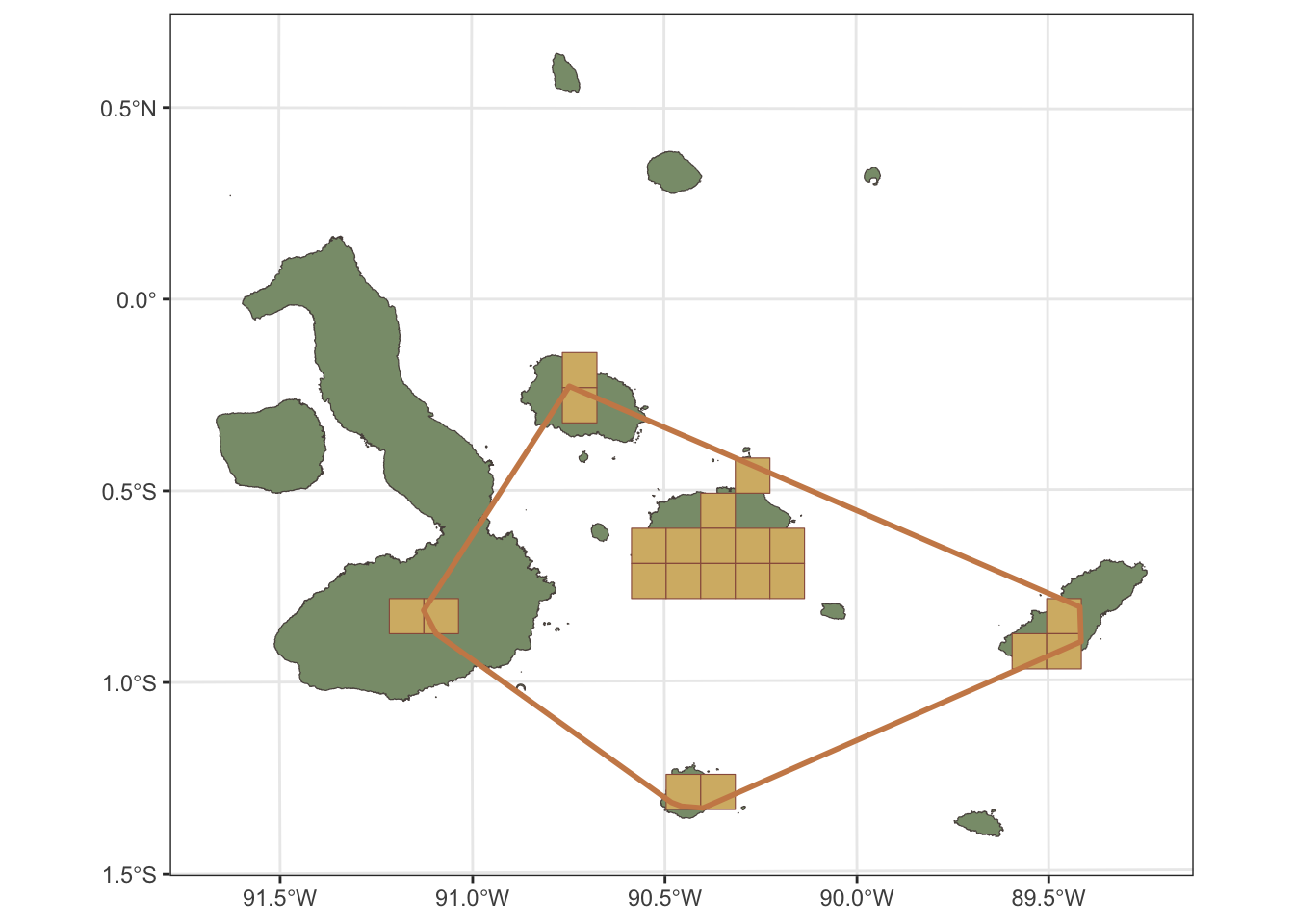 Now we have the EOO and AOO calculated for Nannopterum harrisi, we can visualise these on the map of the Galápagos Islands. The EOO can be visualised as a polygon that represents the minimum convex hull that encompasses all the occurrence records, while the AOO can be visualised as a grid of cells that are occupied by the species.
